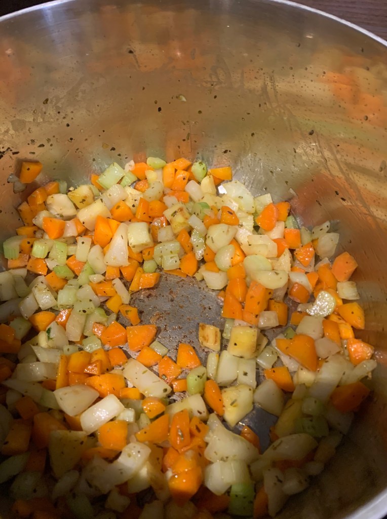 Start by dicing all of the vegetables into similar sized 1-2cm pieces (about the same size as a chickpea actually, just to keep things simple). Add a splash of olive oil to a deep sided stock pan over a medium heat, then add the diced veg, Herbs de Provence and sprinkle of salt, and sweat everything down for 6-7 minutes until it starts to catch and caramelise on the bottom of the pan.